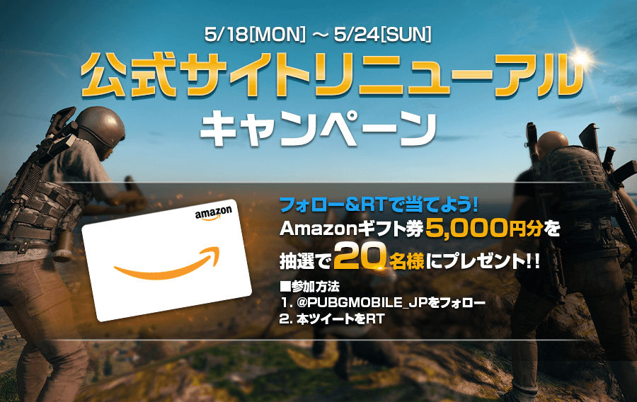 公式サイトリニューアルを記念して、フォロー&RTキャンペーンを実施します。キャンペーン期間中に、公式Twitter(@PUBGMOBILE_JP)をフォロー&対象のツイートをRTした方の中から抽選で20名様に「Amazonギフト券5,000円分」をプレゼント!